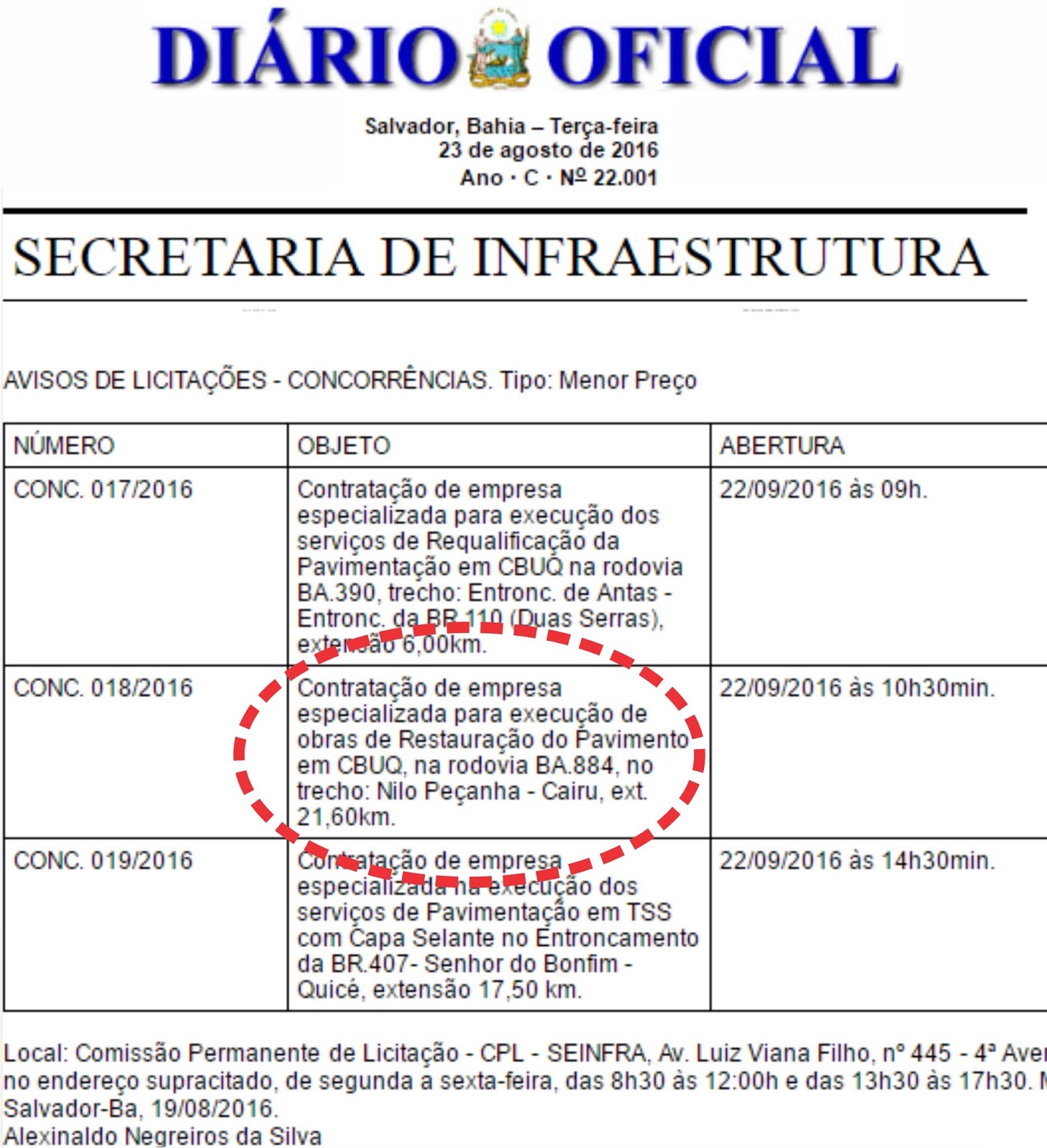 Um dos principais pedidos do prefeito de Cairu, Fernando Brito, acaba de ser atendido pelo Governador Rui Costa, com a publicação, no Diário Oficial do Estado, do aviso de licitação para a restauração dos 21,6Km do pavimento da BA-884, que liga os municípios de Nilo Peçanha e Cairu. Esta importante obra faz parte das reivindicações dos moradores da região, principalmente os residentes na Sede de Cairu e nas diversas comunidades litorâneas, como Torrinhas, Tapuias, Boipeba, Canavieiras, Cova da Onça, Itiúca, São Francisco, Barroquinha, Barra dos Carvalhos, entre outras. "Fico bastante feliz com essa boa notícia, pois os meus conterrâneos de Torrinhas sonham com essa intervenção do Governo do Estado. Nós dependemos do turismo para sobreviver e a recuperação desta estrada vai nos dar muito mais qualidade de vida", disse o vereador Bino Santos. A abertura da licitação será no próximo dia 22 de setembro. A pavimentação da estrada será totalmente recuperada em CBUQ (Concreto Betuminoso Usinado a Quente), com investimento previsto de R$ 8,6 milhões.